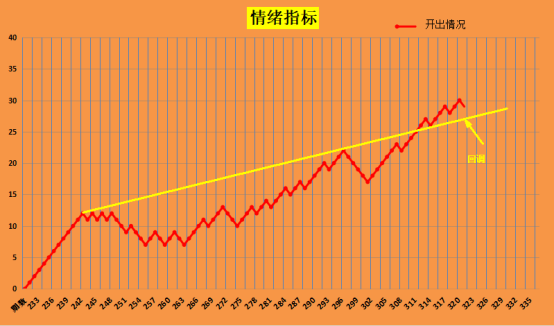 321期开出542,昨天的三胆都没有开出。昨天主要是看的对码23的胆码,结果对码2开了胆2没有开胆7,从胆指标来看2路号还是走强,所以2路号当中选了胆8,结果开了另外两个胆。组三遗漏0没有出现连开,现在还是处于0-1这个密集落点区间内,继续执行。我们再来看看情绪指标的情况,如下图: