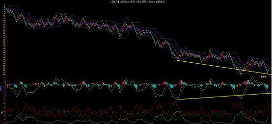 上图是组三的K线图,图中可以可以看到K线和macd目前是一个底背离的形态,形态上来看反弹的概率还是比较大,昨天遗漏0这个点没有连开,现在遗漏1了,图中可以看好遗漏1这个点是底部走节奏的,昨天蓝格子,今天红格子概率比较大。