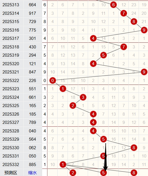上期跨度为3,近5期跨度开出情况:第25328期开出4,属于偶数,1路号码,金属性;第25329期开出2,属于偶数,2路号码,火属性;第25330期开出6,属于偶数,0路号码,水属性;第25331期开出5,属于奇数,2路号码,土属性;第25332期开出3,属于奇数,0路号码,木属性;