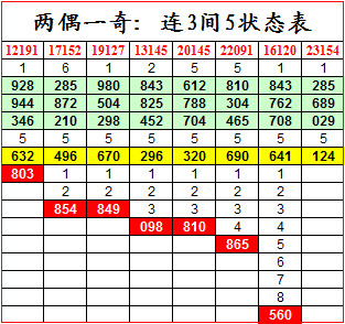 把历史上连开三期,间隔5期开出两偶一奇的现象一一列出,从图表中可以看到,曾经出现过七次,标题下面一行,代表首始期号,单元格中的有底纹三个数字是开奖号码,没有底纹的数字,代表遗漏值。