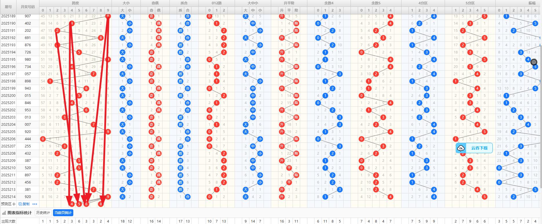跨度预判 - 跨度:上期跨度为9,属于大跨度范畴。根据历史跨度数据的统计结果,近十期大跨度与小跨度的比例约为5:5;9-0-3-2-5-5-2-2-7-9;012路比为4:1:5;因此,本期建议关注跨度4.、5、6、8特别是跨度.6.8.等数值。