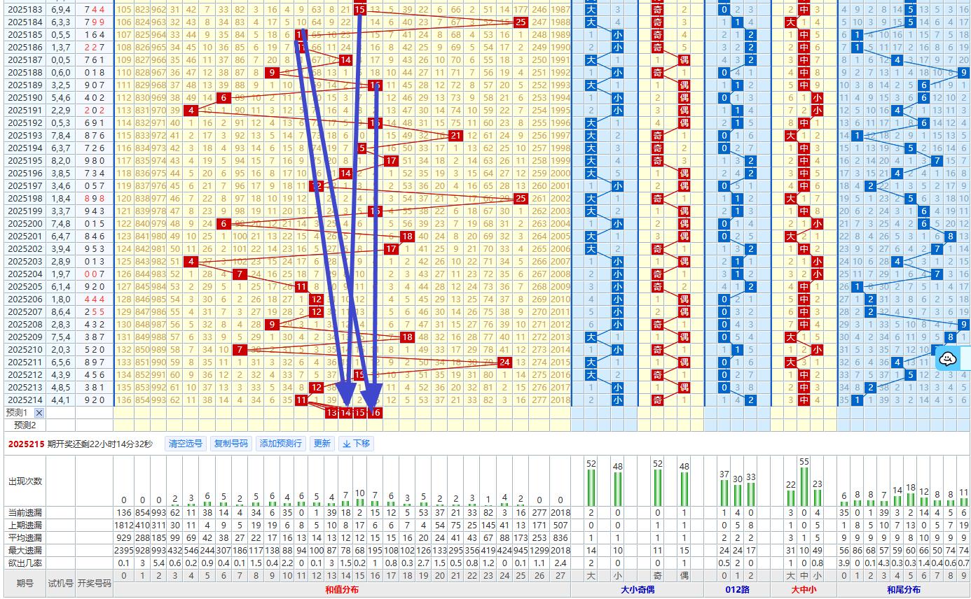 和值预判 - 和值:上期和值为711,处于近期和值波动区间7-24之内。206期关注和值13.14.15.16..关注和值16.