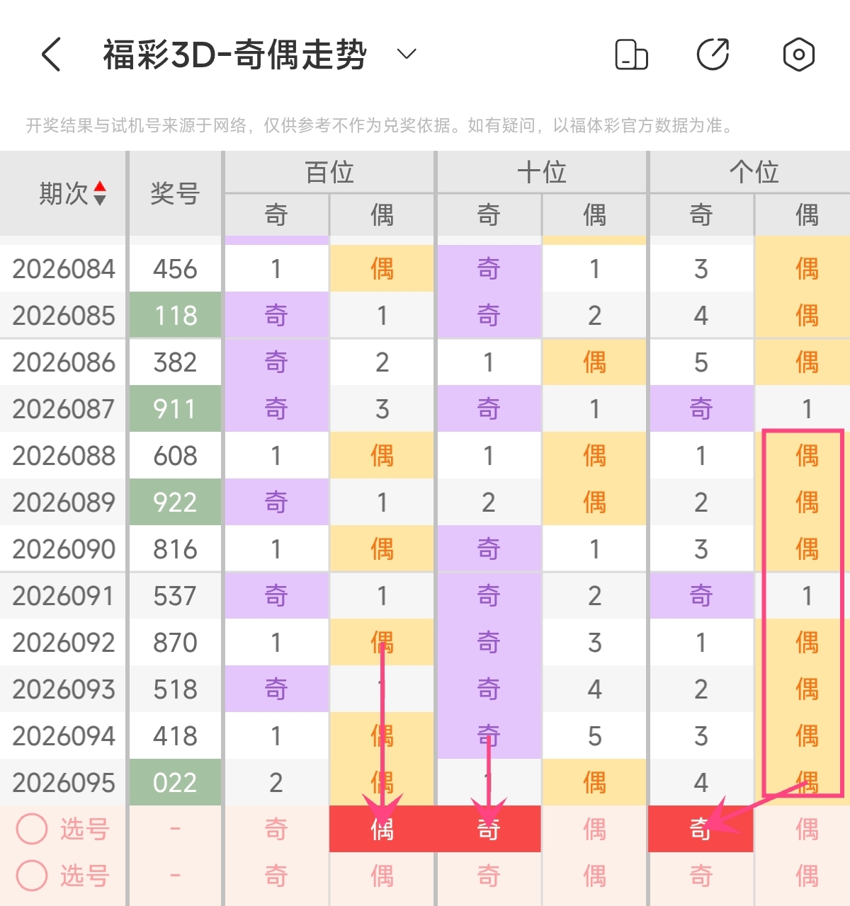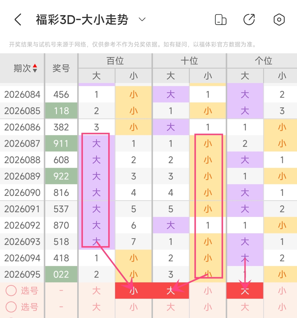 首先让我们回顾一下上期福彩3D第2026095期开奖号码为022,为组三形态,大小比为0:3,奇偶比为0:3,跨度为2,和值为4。