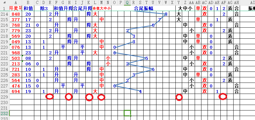 如上图3,根据和值升平降来看,和值降的概率很大,也就是小于19的和值,关注19以下的和值。