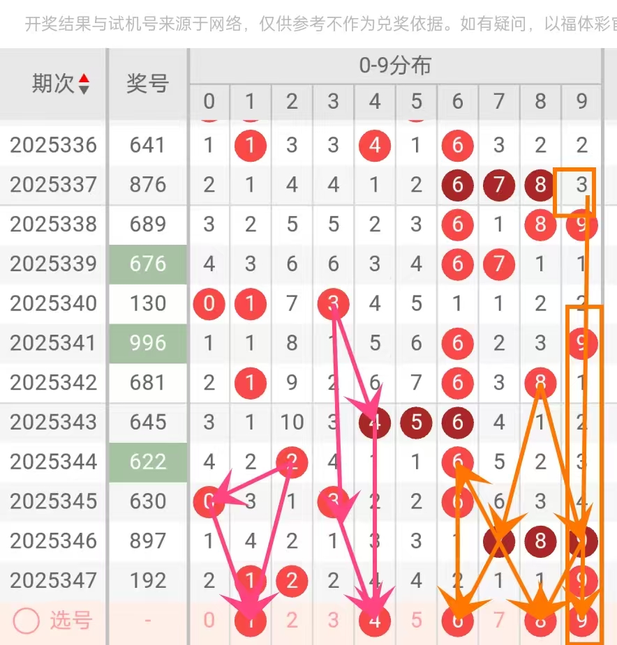 推荐理由:高频次且具备“接力热态”特征,近30期出现15次,多与“6、8”等强势号码搭配出现,形成“强势组合”。该号码在2025-12-26(8,9,7)、2025-12-21(9,9,6)中表现突出,甚至出现“双9”形态,显示其“青出于蓝”的爆发力。从历史走势看,“9”在经历短暂冷期后往往迅速回补,具备较强的自我修复能力。近期虽略有降温,但仍在“6”的带动下保持活跃,预计将在接下来的2期内以“接力形态”再次走强,尤其适合作为“组合胆”使用。