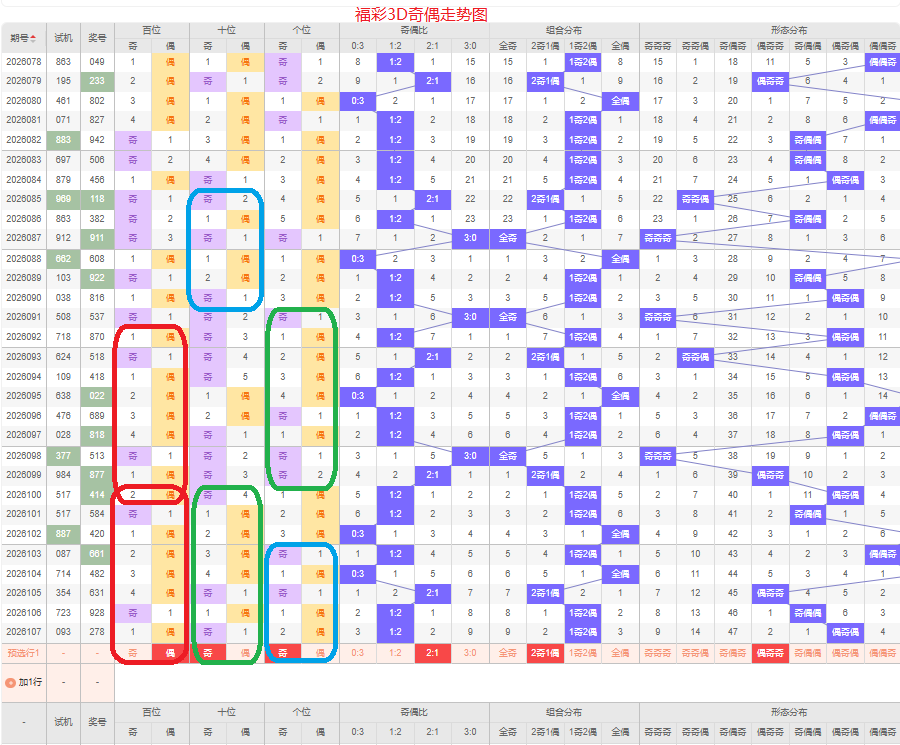 上期奇偶比是1:2,两偶的号码组合方式,从近五期的奇偶数出现情况看,奇数出现5次,偶数出现10次,奇数号码出现较少,本期侧重两奇的号码组合,侧重偶奇奇或偶奇偶的号码组合方式,根据奇偶形态做五码定位02468/13579/13579或02468/13579/02468