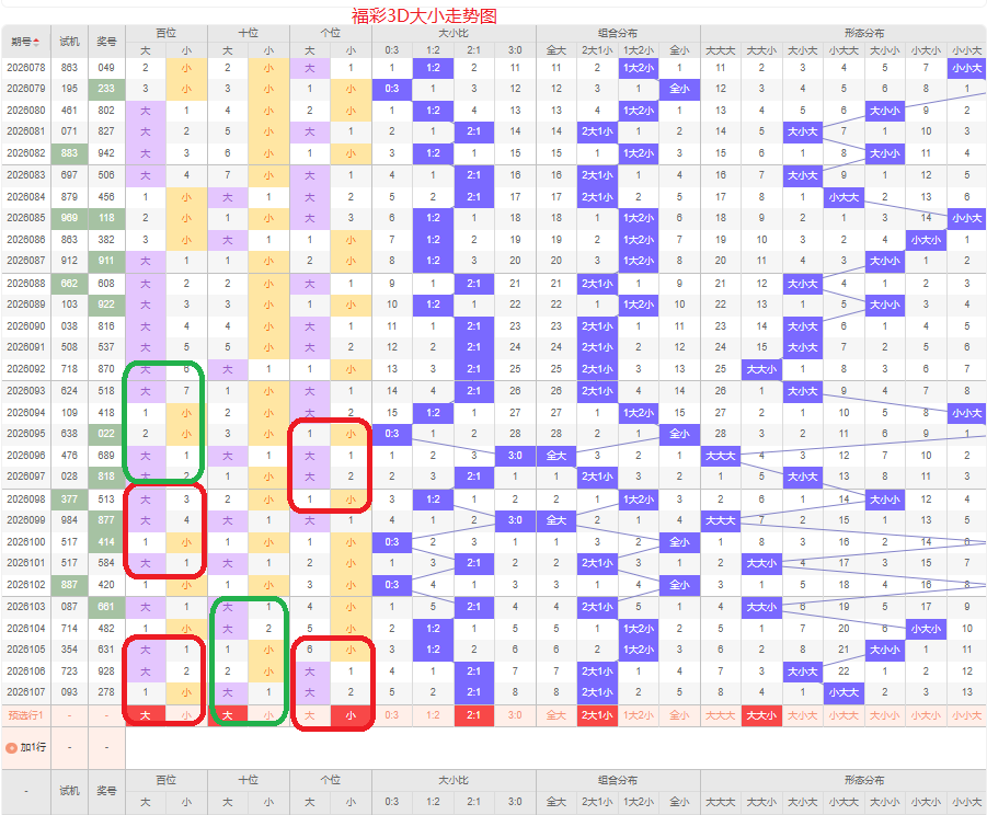 上期大小比为2:1,两大的号码组合方式,从近五期出现情况看,大号码出现8次,小号码出现7次,大小号码出现较少,本期侧重两大的号码组合,本期百位侧重大号码,十位侧重大号码,个位要侧重看小,侧重大大小或者大小小的号码组合,根据大小做五码定位56789/56789/01234或56789/01234/01234