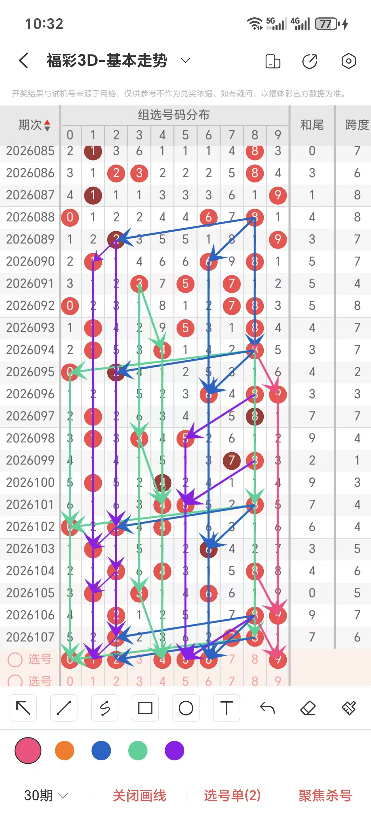 跨度通常情况下在五期之内重复一个跨度的概率很高,近五期重复了5/6的跨度,近五期跨度为5/6/5/7/6,近期02路的跨度较热,上期是0路的跨度,本期要侧重跨度以3/5/6跨为主的号码组合。可以从跨度方面选择相应的双胆码组合,双胆码的选取要根据近期和历史的走势进一步的分析选取。