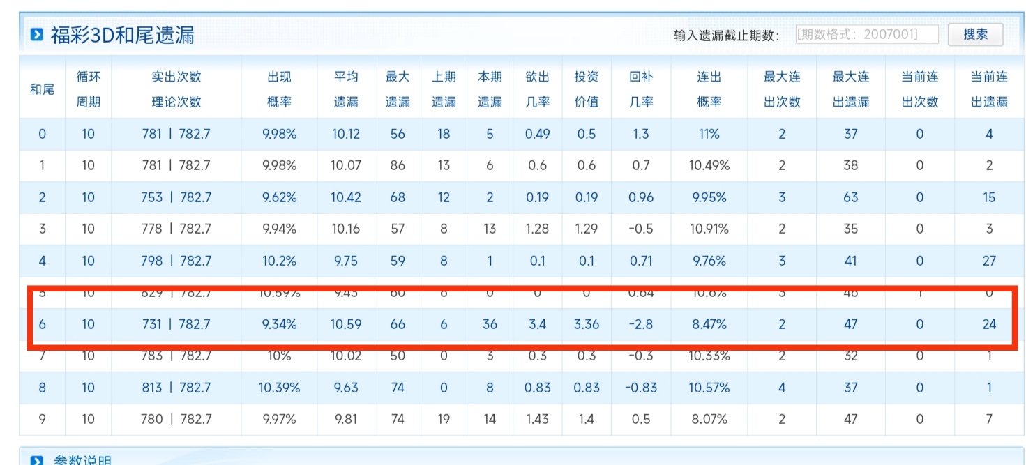 和尾6遗漏36期,历史最大66期,预计10期内开出。共计100注,需要投入200元。可以是适当防,注意入场时机。