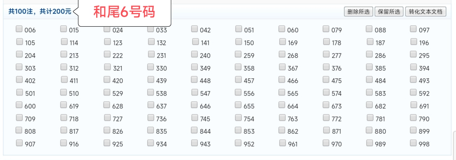 近期重点关注和值尾6遗漏36期,最大遗漏66期,预计10以内就会开出,全包共计100注,投入200元,可结合胆码减小投入。