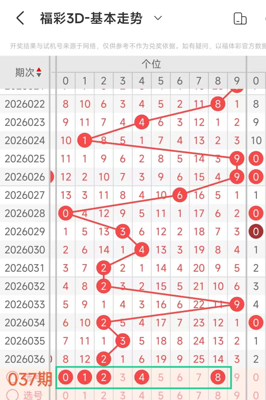 经统计0号出现7次、1号出现4次、2号出现1次、3号出现7次、4号出现8次、5号出现4次、6号出现11次、7号出11次、8号出现8次、9号出现7次.统计后出现次数靠前的数字作为我们的备选号码.其号码有0346789等