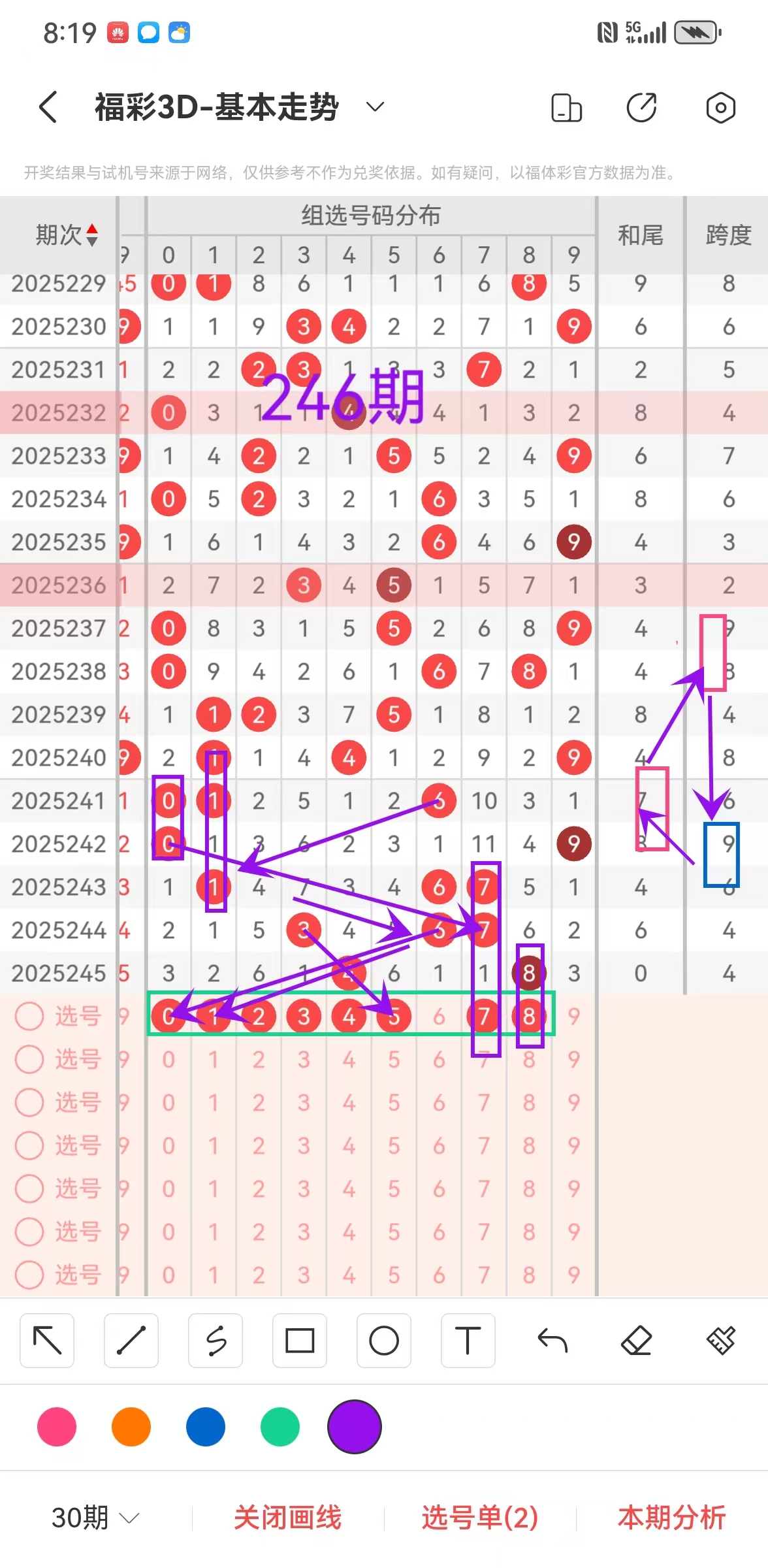 以上分析数据为:福彩3D第246期,啤酒哥本人推理和18年购彩经验所得,助力您选号