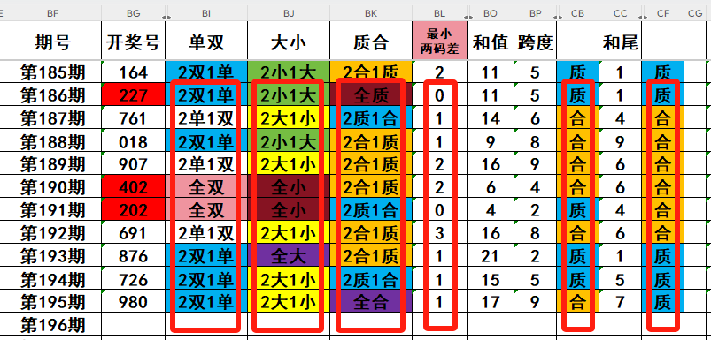 3,最近10天当中,两质一合开出3次,两合一质开出5次,全质数开出1次,全合数开出1次。近期需重点关注开奖号码两质一合的回补!