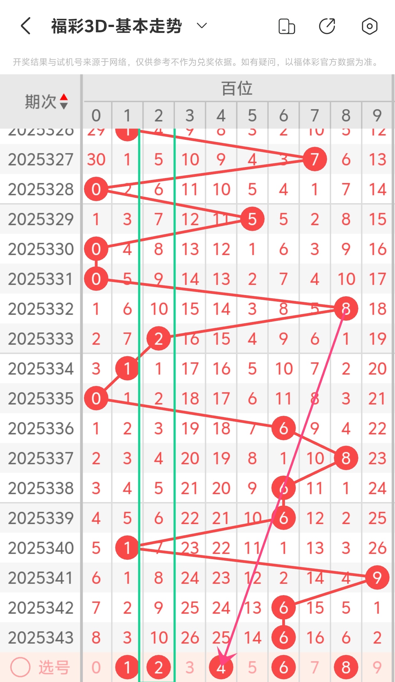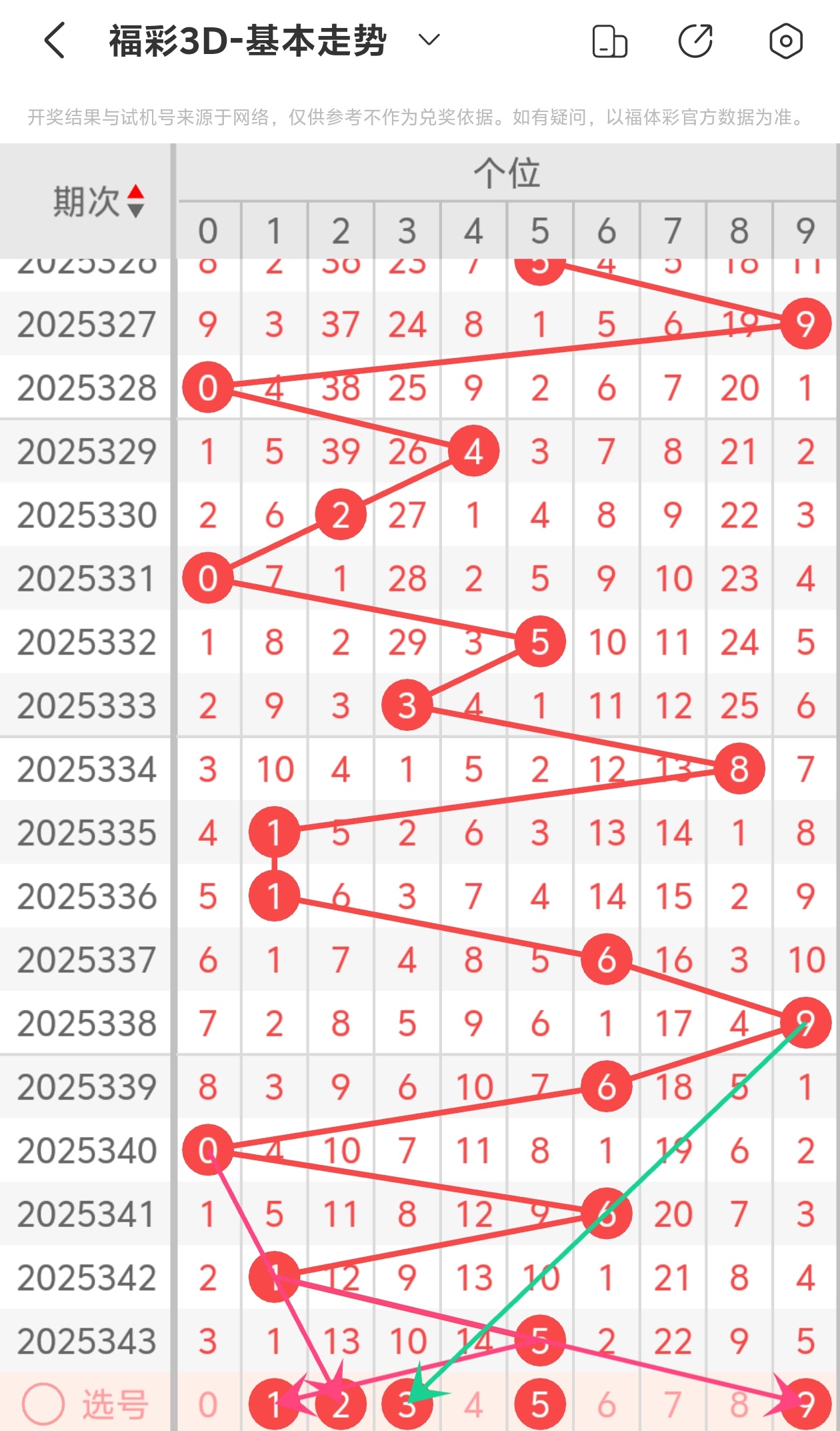 上期个位开出5,本区与上期的跨度为4,本期我们可以从上面走势图中看出选号的思路,2为斜连走势跨度为三,3为斜连走势跨度为二,5为重码,9为斜连走势跨四,综合以上分析,本期个位推荐:12359