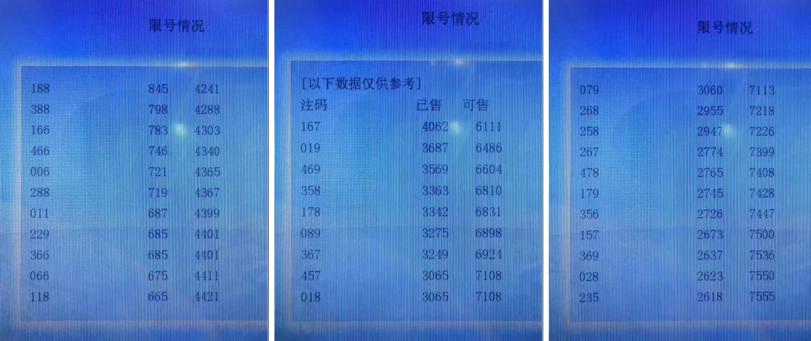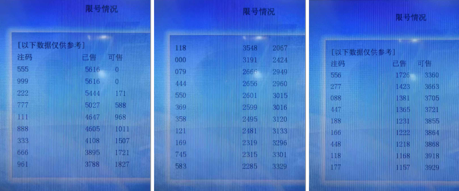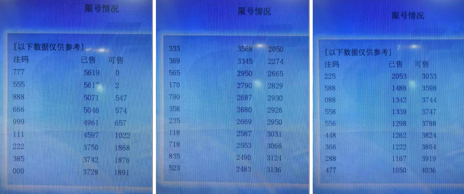 福彩3D有几个数据非常值得我们研究,一个是试机号(一般是下午6点左右发布),另一个就是每期的限号数据(也就是当期哪些号码已经达到上限,不能再打进去了),我主要是统计近三期的限号数据(不同地区和不同时间数据会有变化),个人感觉这个限号数据代表大家看重的号码或者某种趋势(可以理解成冷热程度),同时考虑大家看号的数据具有一定的延续性,值得我们参考研究,接下来我们统计一下近三期的数据,福彩3D限号数据有三个类型,分别是单式、组三、组六,分别都有20组号码,我们分别分类进行出次统计,我主要取前四码来做胆码,并分别拆分为两码作为缩水参考使用。