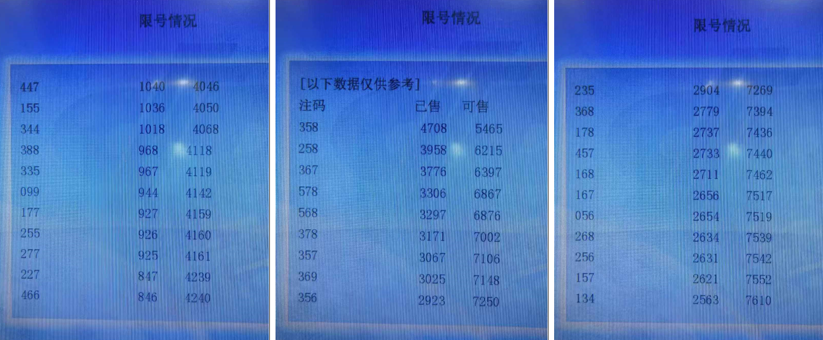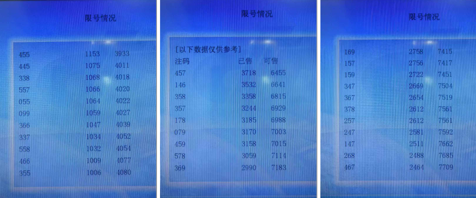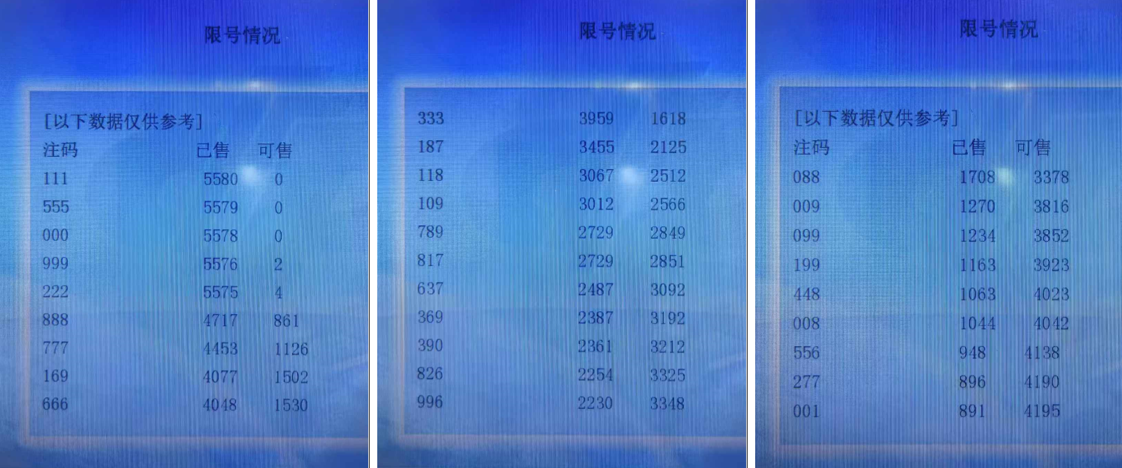 福彩3D有几个数据非常值得我们研究,一个是试机号(一般是下午6点左右发布),另一个就是每期的限号数据(也就是当期哪些号码已经达到上限,不能再打进去了),我主要是统计近三期的限号数据(不同地区和不同时间数据会有变化),个人感觉这个限号数据代表大家看重的号码或者某种趋势(可以理解成冷热程度),同时考虑大家看号的数据具有一定的延续性,值得我们参考研究,接下来我们统计一下近三期的数据,福彩3D限号数据有三个类型,分别是单式、组三、组六,分别都有20组号码,我们分别分类进行出次统计,我主要取前四码来做胆码,并分别拆分为两码作为缩水参考使用。