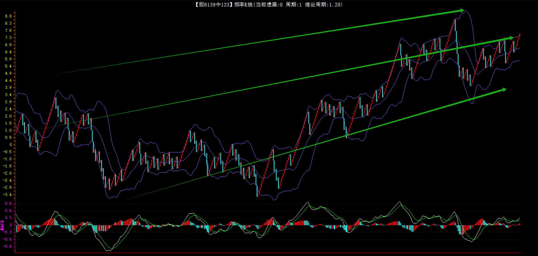 整体趋势上行,上边沿线趋势向上,下边沿趋势也是向上,节点震荡,当前遗漏1期,本期关注。