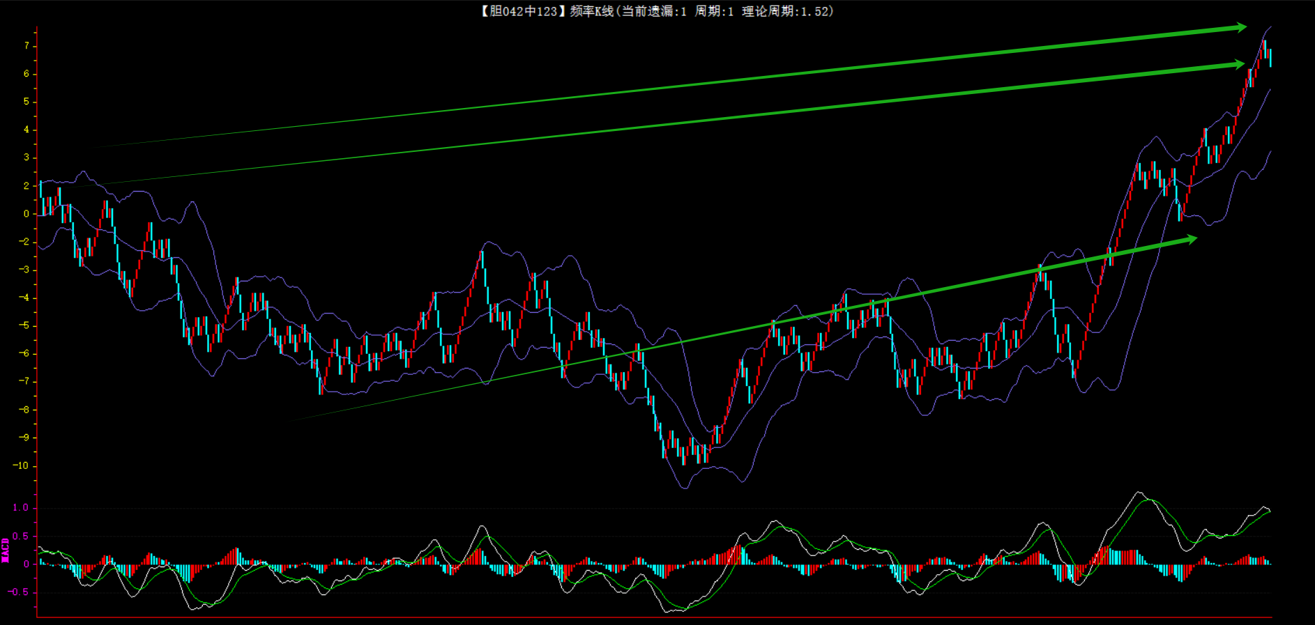 整体趋势上行,上边沿线趋势向上,下边沿趋势也是向上,节点震荡,当前连开6期,本期关注。