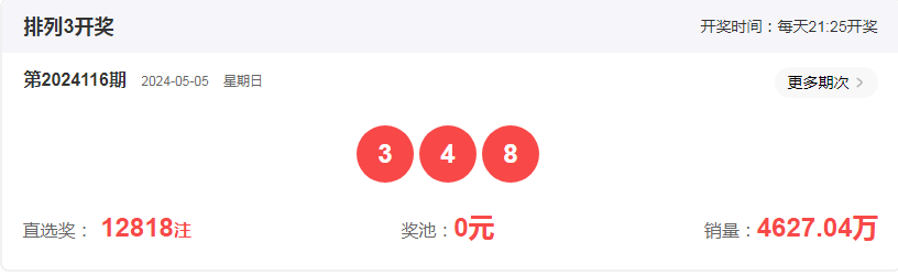 排列三第116期开奖回顾:开奖号码:348,形态:组六