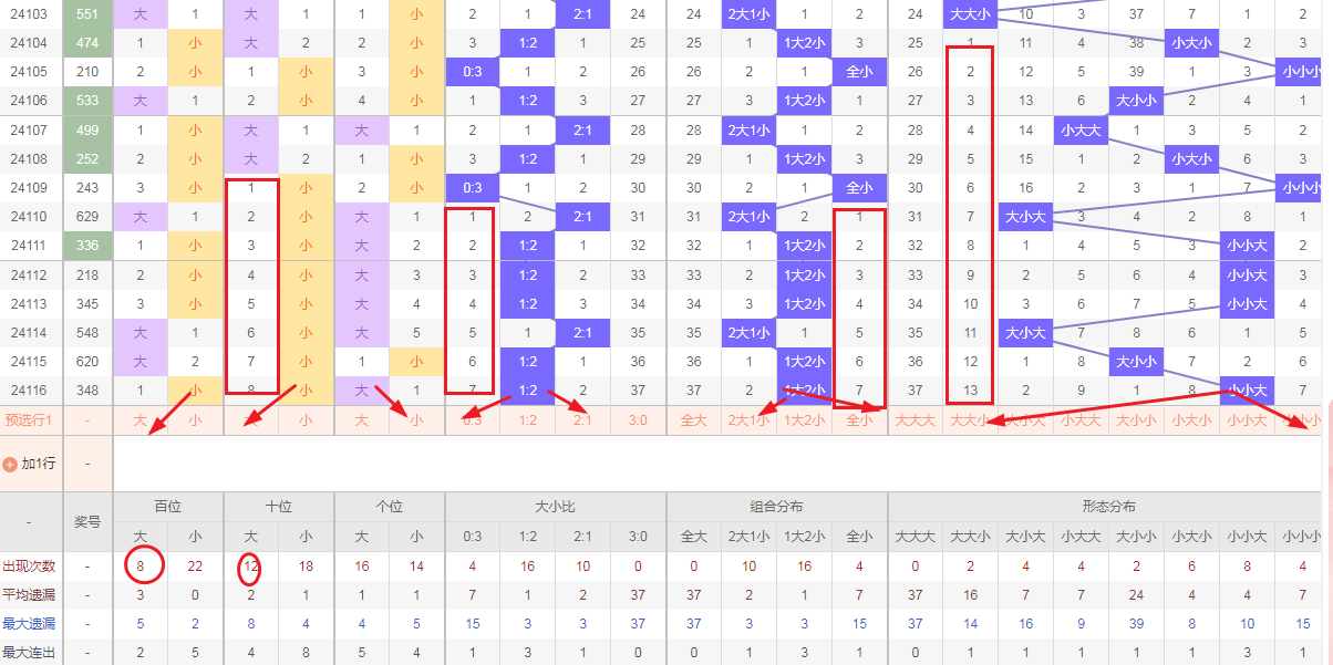 排列三 大小形态分析:从大小走势图上可以看出排列三100期内百位大小比为44比56,十位大小比为48:52,个位大小比为53比47除了十位偶数比奇数多,百位和个位都是奇数比偶数多。历史数据近2期开出大小小后下一期的走势为,第87期开出大大小第88期继续开大大小。第94期开出大大小后第95期开小大小,第106期开出大小小后107期大大小。可以看出开出大小小形态后形态转变过快,不过还是能看出开出大小小形态后下一期还是比较规律的进行切换,这时遗漏数据就显示作用的时候,结合遗漏数据再加上开出小小形态后容易进行下一个类型变化。所以排列三第117期大小形态推荐大大小防小小小。本文由一起彩作者钱是生命动力所著请勿抄袭