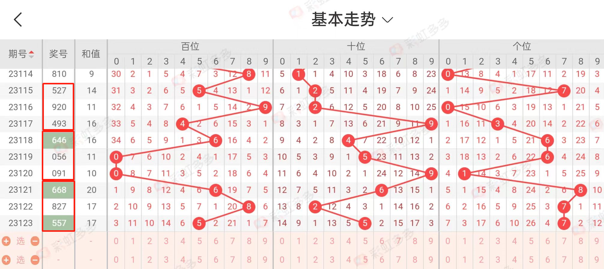 在走势中(如图标线所示)我们可以明显发现当期开奖号码与上期开奖号码以及当期试机号和上期试机号非常容易产重复1~2枚的特征现象,因此我们要注意适当结合上期开奖号以及试机号作为号码综合参考。有关更多详细选号思路以及号码组合搭配我们下午16点~17点有选号思路详细解析的直播节目欢迎大家前来一期探讨交流点击此处字条及图片可提前进入直播间小车获取精准号码组合方案,我们一起体验中奖的快乐!!!