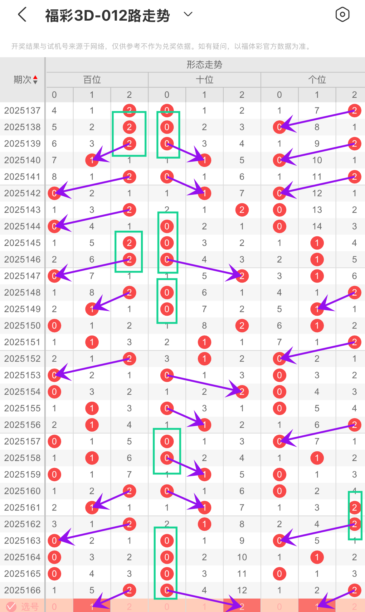 根据上期开出0路连下分析,0路连下强势,经常连着几期出,像霸屏似的,形成短期强势。要是冷不丁没0路了,箭头回补马上接上,让它别消失太久 。1路没0路那么执着,出出停停,可一旦0路连出后,箭头回补就把1路喊回来,和0路竞争。2路出号没前两路那么起眼,频率相对稳,本期参考回补2路(258)