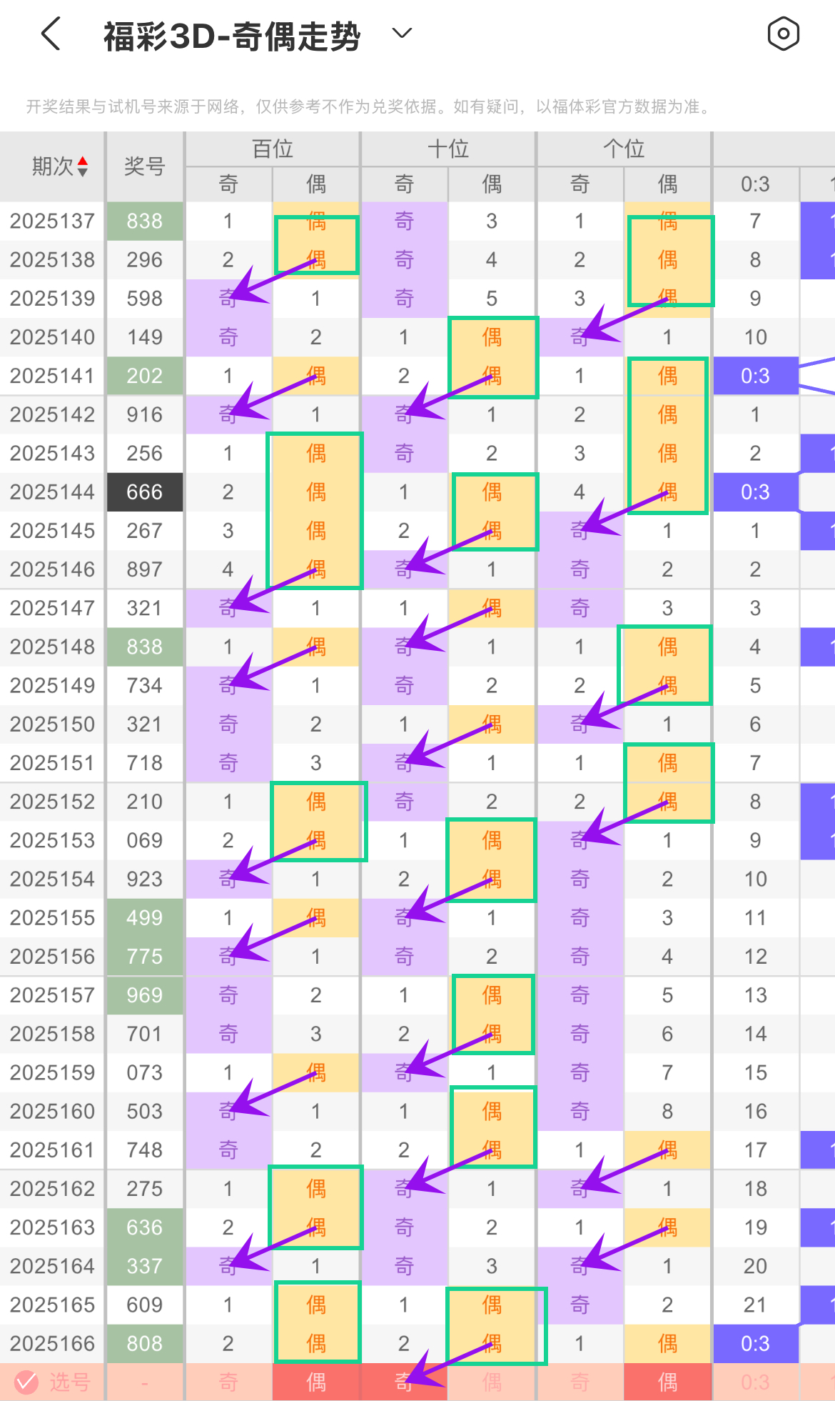 根据上期开出偶数连下分析,奇数出现频率不低,常作为基础出号。箭头回补使奇数在小遗漏后快速回归,偶数虽不频繁,方框连下时能短期连续出号。像是奇数打底,偶数偶尔穿插,回补让奇偶节奏有变化,形成奇数为主、偶数补充的走势,本期参考回补奇数(13579)