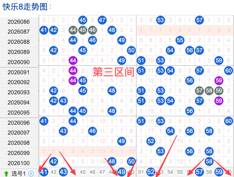 三区间开出了4个奖号(42.48.50.58)上期回顾三区开出4个奖号上期的三区间的奖号数量呈现一个递增的形态,4头回补2个,5头回补2个,本期先来看号码41期出现频率相对来说还不是很稳定。偶尔有时间隔期数也不是很稳定,但是在近期的开奖中较温热注意防守,号码43在近 30 期内出现次数相对不是稳定的号码,近期的活跃度也是较温冷。号码52有一定的间歇性,通常间隔5-10期会出现一次,没有明显的连续出现态势,走势相对还不是很稳定,在整个第三区间的表现较冷本期还是可以防守的。号码57走势相对近期较温热,近期没有连续间隔落号的情况,活跃度近期处于温热状态注意防守。