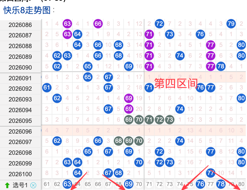上期四区间开出了4个奖号(64.67.68.77)上期的四区开4个奖号呈现了一个递减趋势,开出的奖号6头回补3码,7头回补1个,先来看号码63在近 30 期内属于还是稳定的号码,近期出现频率相对温热,偶尔会间隔多期后出现一次,这个号码要注意防守,号码69具有一定的间歇性近期活跃度是很稳定比如有时会间隔3到8期就再次出现,有时会间隔多期,近期整体出现频率比较热,近期还是要关注的.号码78活跃度近期比较冷,有一定的间歇性,整体走势有一定的波动性.