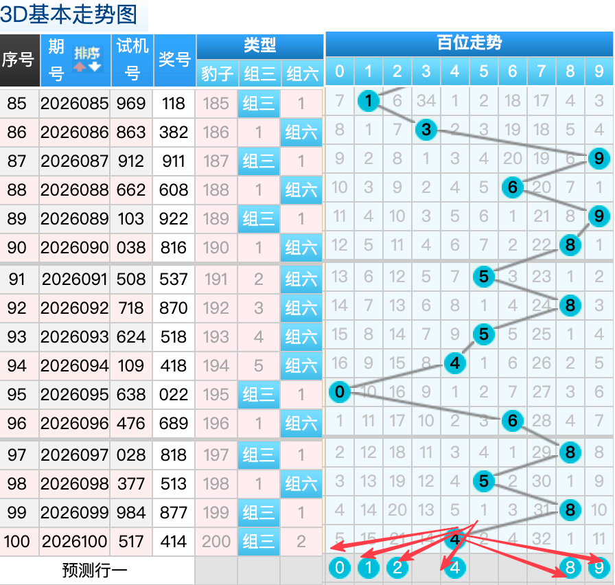 3D上期百位开出4号球,这个奖号4是一个热码的回补落位趋势也是一个比较好的符合百位上的落位点,先看8号球这里还是有机会继续走出一个热号码折返的落位趋势还是要注意防守的,还有一个就是9号球这里的是5跨落位形态在这里的机会还是很好的要注意防守,然后1号球这里要注意是一个3跨的冷码回补落位趋势注意防守,4号球在百位上要注意可能有机会走出重码的回补概率 。