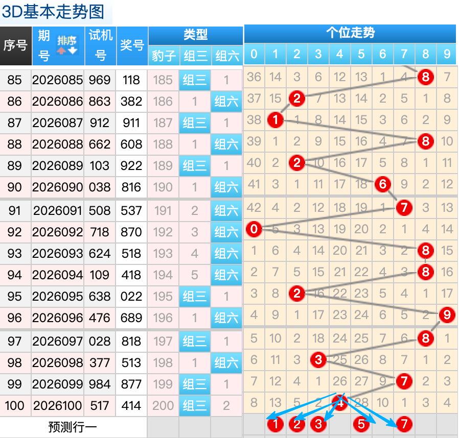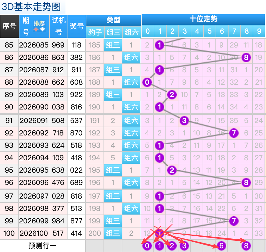 上期3D十位开出的奖号1号,上期在十位上1号球这个号码是一个折返回补码的落位点,本期来看1号在十位上要注意这个号码是有机会继续走出热号重码落位的趋势这里的号码回补形态注意防守就好,再来6号球这个点位注意防守走出5跨冷号码的落位趋势。0号球这个小冷号的落位回补要注意参考。8号球要注意走出小号码拽大号码的落位回补。