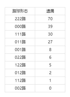 1.首先是观察222路、000路以及111路的组合,其中全二路的组合遗漏70期,000路遗漏39期,111路遗漏30期。近期需重点关注开奖号码为222路的回补。