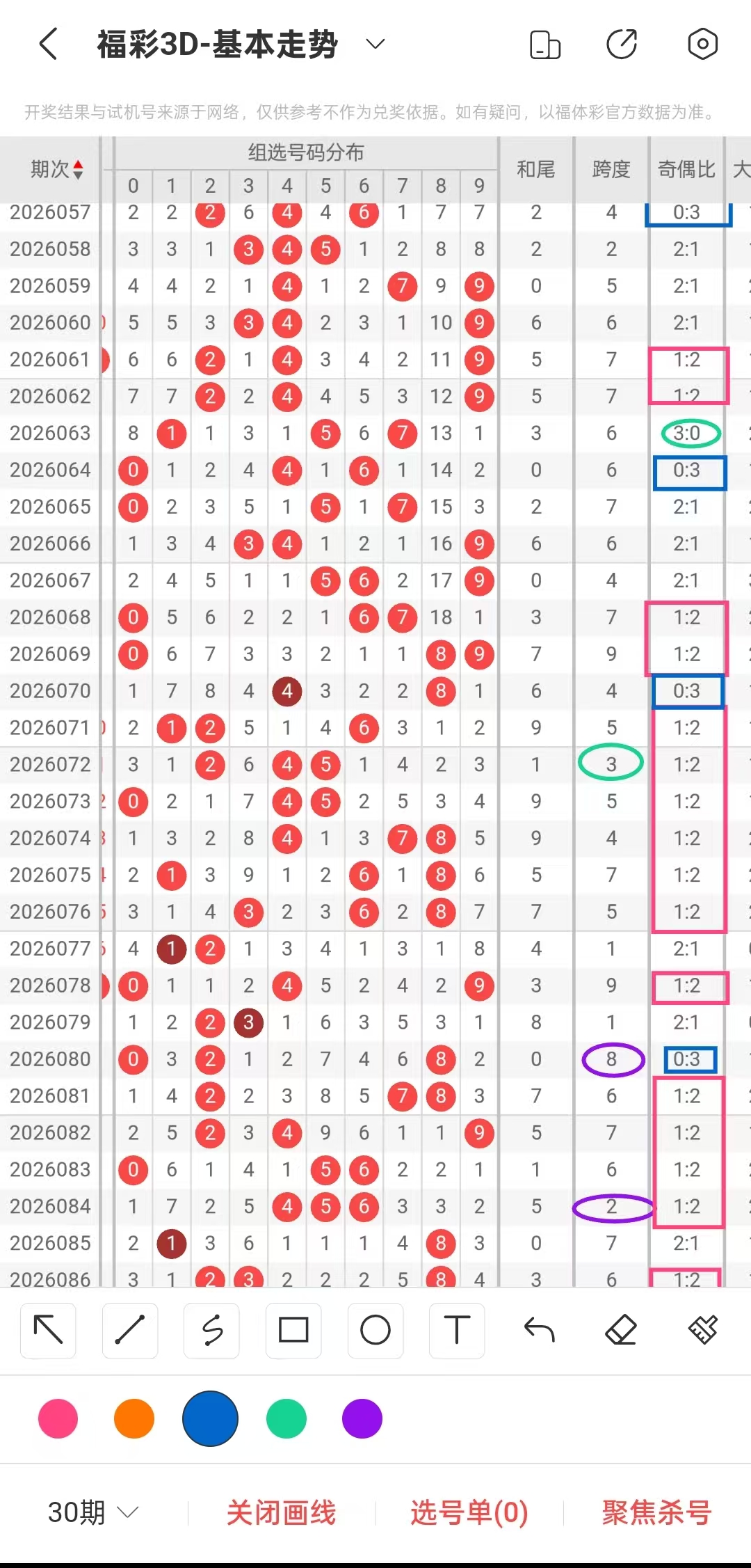 3.近30期中,跨度6和7各出现了7次,2跨和8跨近期需要待回补,所以近期需要关注2,3,7,8跨度。