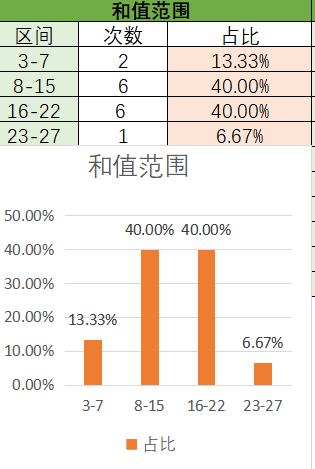 上期和值是12,处在8~15之间,其中8~15占比变大,16~22占比变小。目前是16~228~15占比最优,然后是3~7,最后是23~27。本期看好和值在8~15之间,其次是16~22
