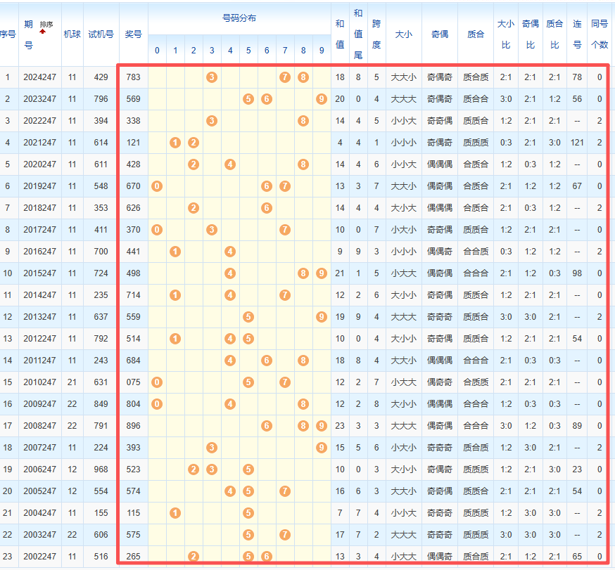 这23期大小比1:2出靠前,这期可以考虑选1:2。奇偶2:1出靠前,奇偶比可以考虑2:1
