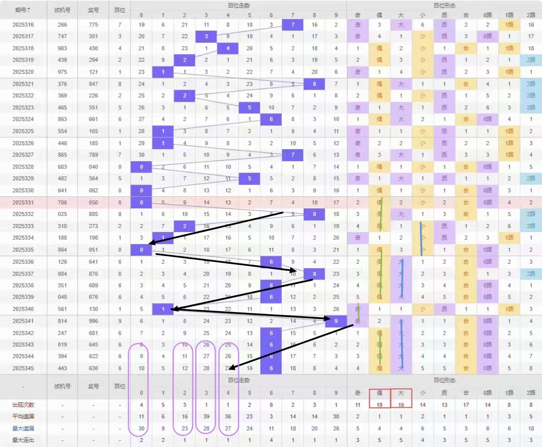 同理分析本期百位奇偶数形态,可以看到近15期开出奇数号3期偶数号12期,开出偶数号的概率是开出奇数号概率的4倍,上四期开出偶数号那么本期开出奇数的概率上升建议选择遗漏期数较大的奇数号。杀号建议定在所有偶数号,但偶数号0号、2号、4号都已经遗漏了10期以上建议开出防冷号开出。