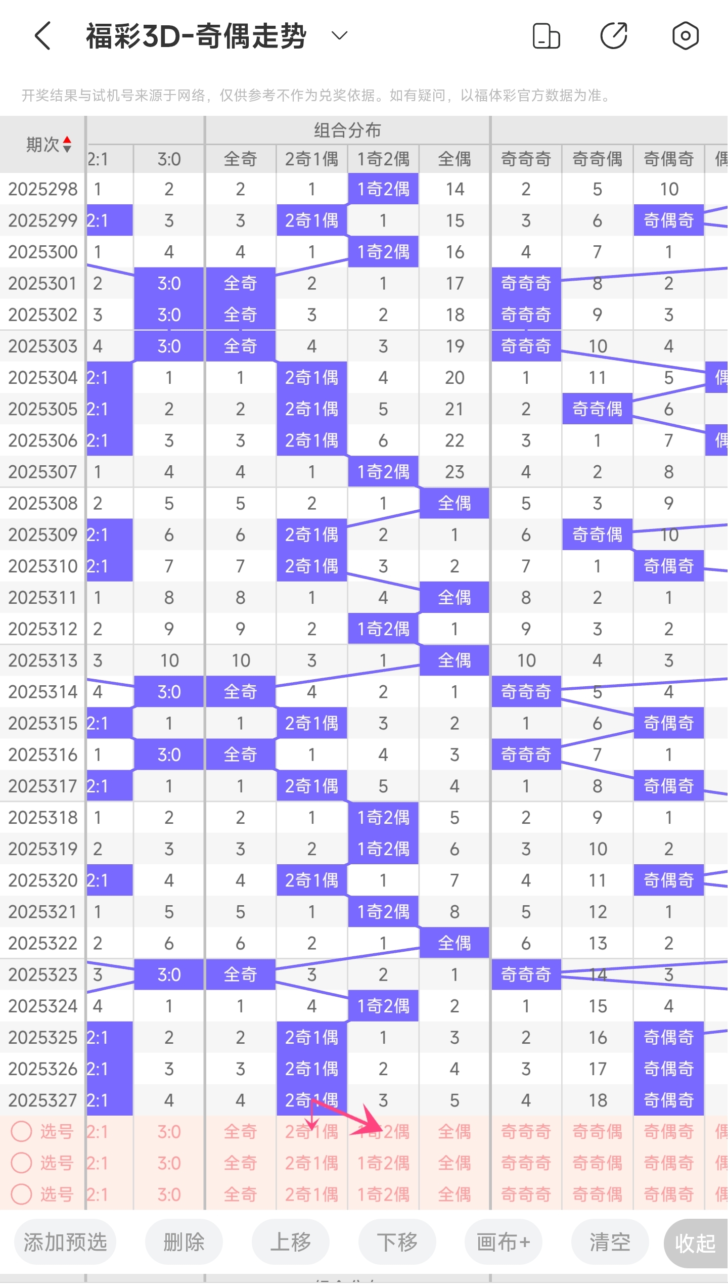 上期开了2奇1偶的情况,往前一期开出的是2奇1偶。从组合数学理论上来讲,开出2奇1偶和1奇2偶的概率都为37.5%,开出全偶和全奇的概率为12.5%。通过分析目前30期内的数据。本期的开出全偶的概率是13.33%,开出全奇的概率为20%,开出1奇2偶的概率为26.66%,开出2奇1偶的概率是40%。和前一期相比,概率没有变化。通过走势图可以看到2奇1偶已经开了3期,非常热门,防过热,所以本期看好1奇2偶回补。所以本期推测可能开1奇2偶,其次是2奇1偶,然后是全奇或者全偶类型。