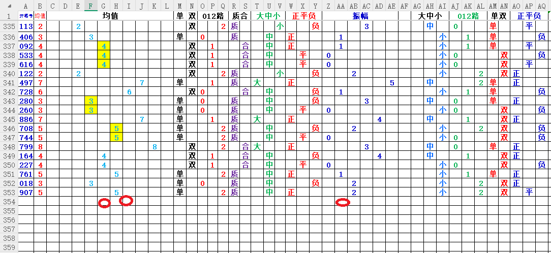 均值:就是开奖号每各数的总和除3,然后得到的余数,如果不够整除可以+1,-1,直到被整除得的数就是均值