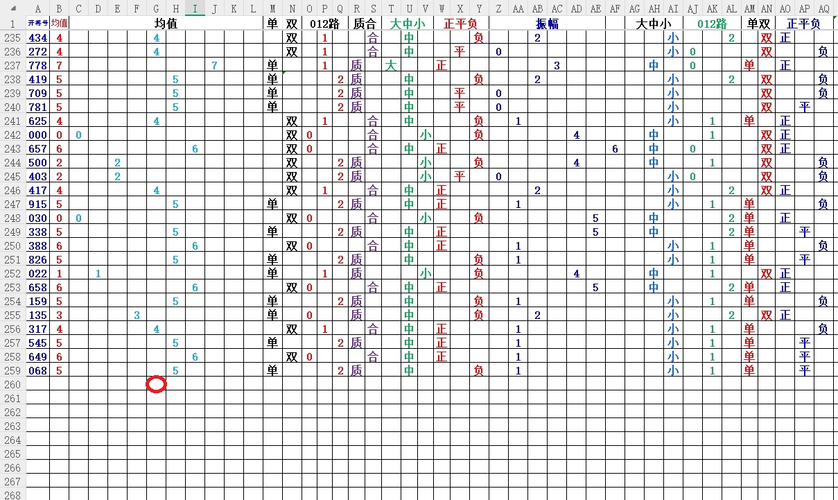 均值:就是开奖号每各数的总和除3,然后得到的余数,如果不够整除可以+1,-1,直到被整除得的数就是均值