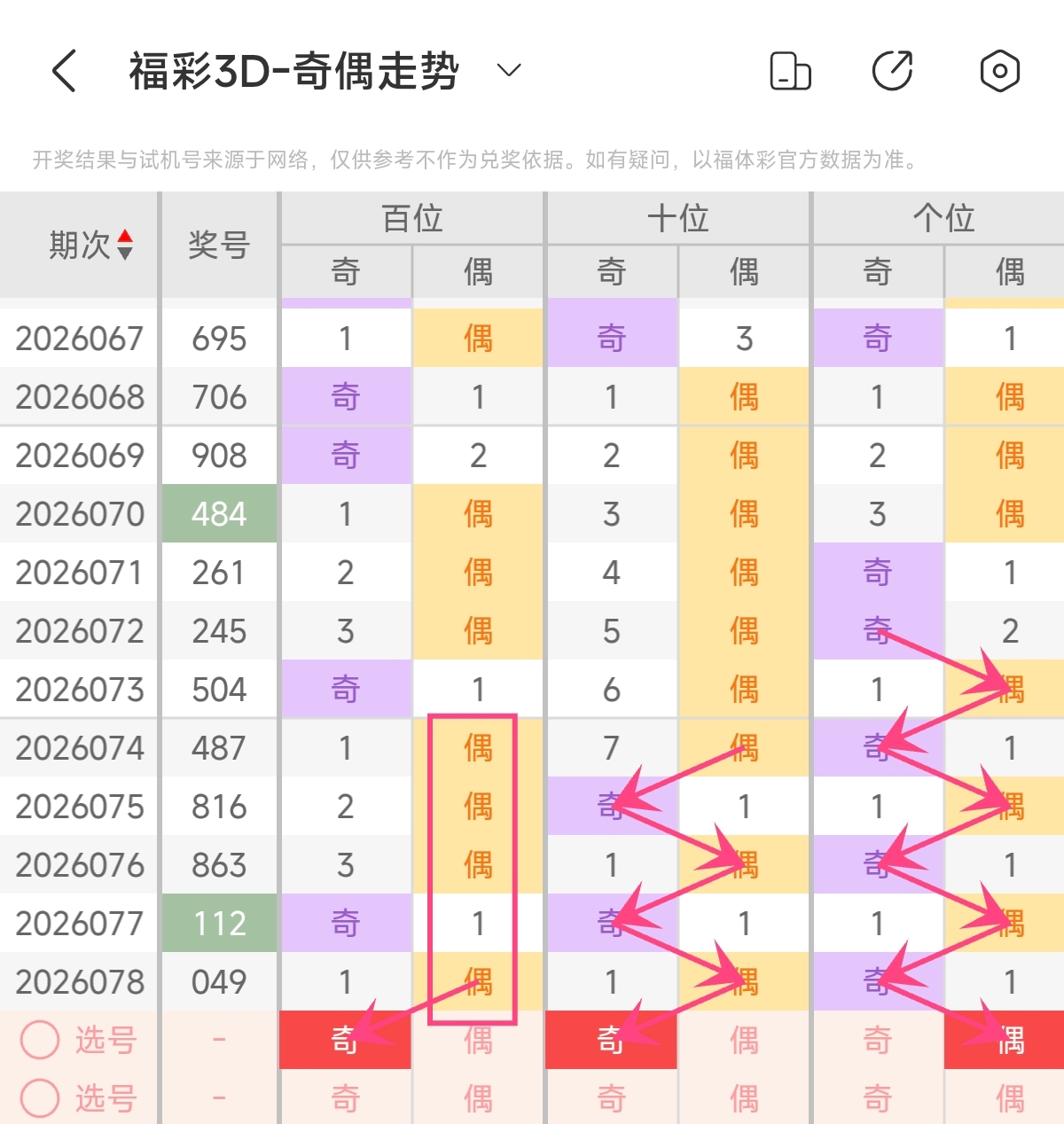 上期奇偶形态为偶偶奇,奇偶比1:2,偶数号码占优。根据近期奇偶形态变化来看,上期