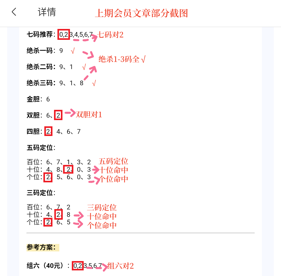 会员文章中双胆对1,七码、组六对2,五码,三码定位中十位,个位均正确。