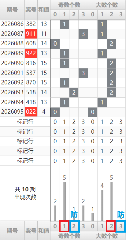 上期大小比0:3,全小组合在近期并不多见。在此之前,大小比一直在1大2小和2大1小之间交替。本期大小比大概率会离开全小,回到1大2小或2大1小的正常区间。考虑到和值反弹的需要,2大1小的可能性略大一些,同时设防开出全大组合。