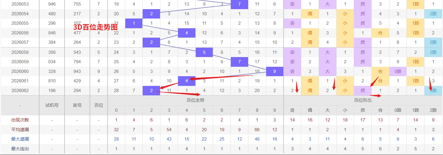 福彩3D个位分析:第2026062期个位开出号码4属于小偶数前端,从以上个位走势图中可以看出近100期的大小比约为47:53奇偶比约为54:46大小奇偶数据上有点差异有需求但不是太明显,不太好看这时就要借助连线走势和遗漏数据来帮助我们缩水号码。上期个位落号“4”小偶数1路号码球,号码开出了5振幅,连续多期的小振必被大振幅取代幅符合我们的预期,那么本期我们在个位考虑振幅走势走前依然要转变思路考虑大振幅,具体考虑(2-6)个振幅是我们主要的方向,那么在对个位落号情况进行系统的分析时我们可以明显的看到个位号码走势呈现大范围震荡,尤其是在号码的落位特点上表现的尤为突出,那么本期我们在个位分析时就要注意号码的风险,避免出现踏空。3D个位近期的走势来看,数字6和8目前均处于深度冷号的状态。这两个号码在个位上的遗漏期数都已经明显超出了常规的统计周期,从号码分布的均衡原理来分析,任何一个冷号在经历了长时间的缺失后都会积蓄较强的反弹动能,正所谓大冷之后必有回补,因此近期对于这两个冷号必须要有足够的重视。具体来看,数字6的遗漏值较大,冷态特征非常突出,其反弹的需求也最为迫切;而数字8同样处于深度遗漏的队列之中,随时都有可能迎来解冻的时机。因此福彩3D第2026063期个位看好12568。