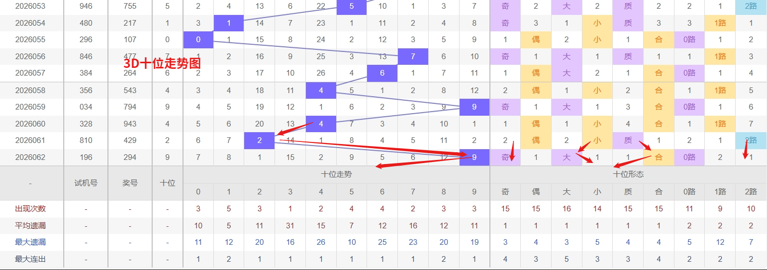 福彩3D十位分析:第2026062期十位开出号码9属大奇数号码后端。以历史100期数据为例十位奇偶比约为55比45,大小比约为51比49近期大小相差7点,根据求均衡的规律开出大数的概率比小数高一点。上期我们分析偶数经过连续回补后有走奇数的可能,开出奖号9大奇数符合我们的预期,3D十位近期的走势来看,数字3目前正处于一个深度冷号的状态,它在十位上的遗漏期数已经明显超出了常规的遗漏周期,从号码运行的均衡原理来分析,任何一个冷号在经历了长时间的缺失后,都面临着回补的需求,这种长期遗漏所积蓄的反弹动能正在不断增强,因此近期对于冷号3必须要有足够的重视,它随时都有可能迎来解冻并出现回补的走势;所以福彩3D第2026063期十位推荐03458。