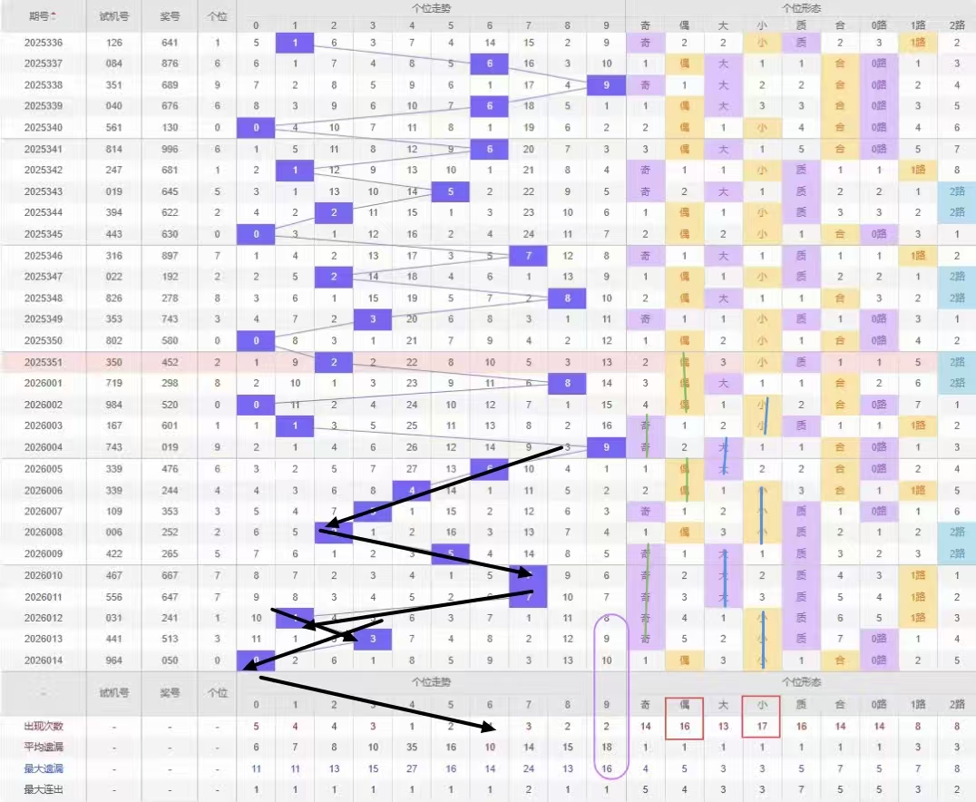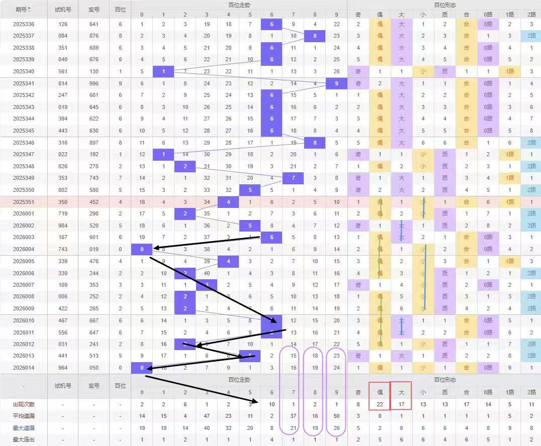 同理分析本期百位奇偶数形态,可以看到近15期开出奇数号3期偶数号12期,开出偶数号的概率是开出奇数号概率的4倍,上期开出偶数号那么本期开出奇数的概率上升建议选择遗漏期数较大的奇数号。杀号建议定在所有偶数号,但偶数号8号都已经遗漏了10期以上建议开出防冷号开出。
