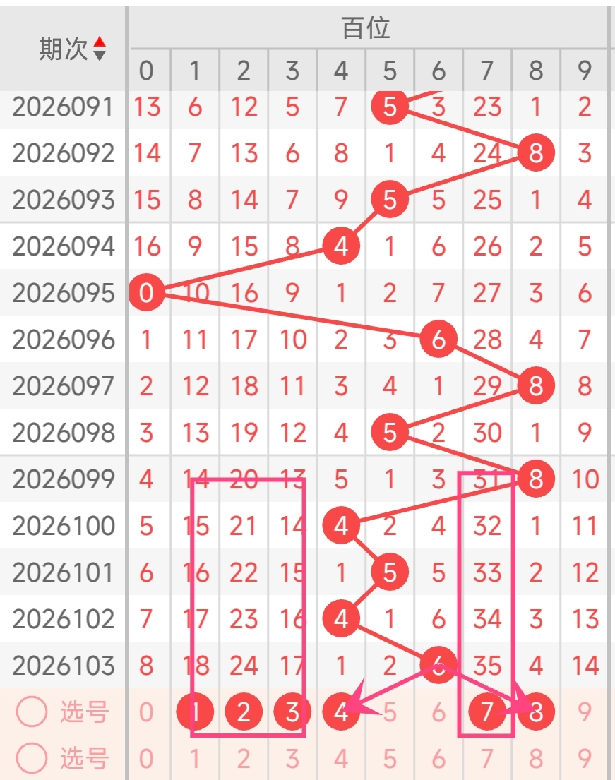上期百位开出号码为6,振幅上升了2点,开出了大数号码,偶数号码。根据近期百位号码走势图来看,上期号码开出6,邻号7已经多期未开出,可重点关注。隔号码4需注意,近期已经隔码开出两次。1,2,3码也需注意。结合近期冷热号码和多期遗漏号码。