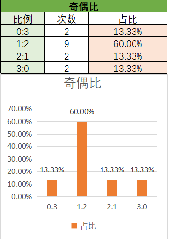 上期奇偶比为1:2,各个类型占比没有变化。近15期内1:2优势最好,然后是2:1,最后是0:33:0上期开了1:2奇偶比,本期看好2:1奇偶比的开出,其次是3:01:2
