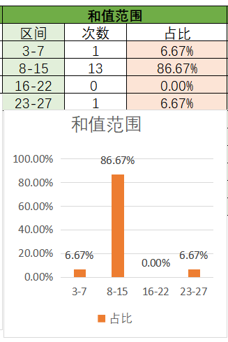 上期和值是23,其中23~27占比变大,16~22占比变小。目前是8~15占比最优,其次是23~273~7。本期看好和值在8~15之间,其次是16~22