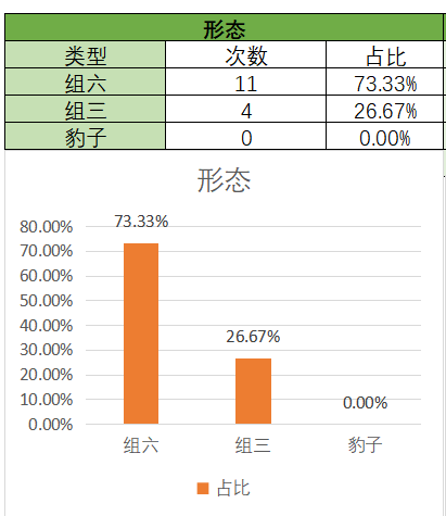 上期开的是组六,各个类型占比没有变化。通过图示可以看到,组六在15期内开了11期,组三开了4期。本期关注组六,防组三