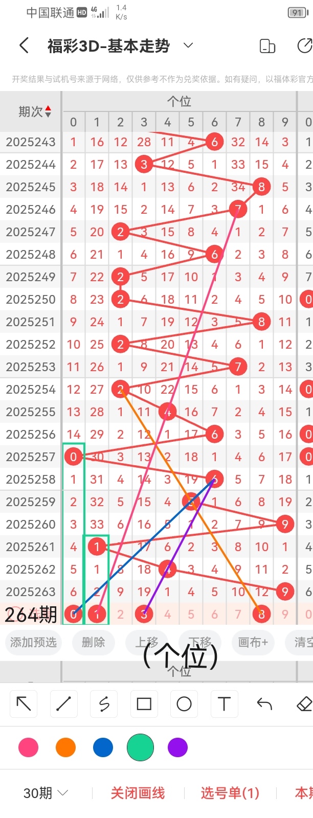 首先,小梁为了感谢各位老板的关注和打赏,特提供一个杀个位的小技巧,同尾杀号法,准确率相当高。根据同尾杀号法,得知本期杀个位4。其次,我们根据图中画线的思路可以看出,号码0与前几期开出的号码呈斜三连的走势且呈隔六期回补的走位,跨度为9;号码1与前几期开出的号码呈斜三连的走位且呈隔两期回补的走势,跨度为8;遗落19期未出的号码3与前几期开出的号码呈斜三连的走位,跨度为6;遗落12期未出的号码8与前几期开出号码呈斜三连的走势,跨度为1。综上所述,小梁依据图中画线思路推荐个位的号码:0、1、3、8。